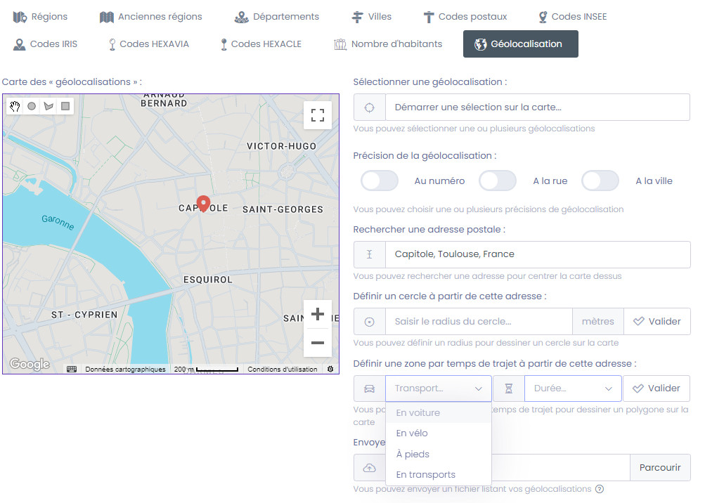 L'onglet "géolocalisation" des critères géographiques, permet de cibler des adresses postales précises, et/ou des coordonnées GPS, et de définir autour de ces adresses un radius exprimé en mètres, ou un temps de trajet à pied / en vélo / en voiture / en transports.