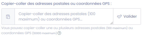 Pour insérer un grand nombre d'adresses géolocalisées, nous vous conseillons d'utiliser le champ copier/coller. Il vous permet d'insérer des lots d'adresses postales (100 max. par insertion) et/ou de coordonnées GPS (10 000 coordonnées GPS max. par insertion).