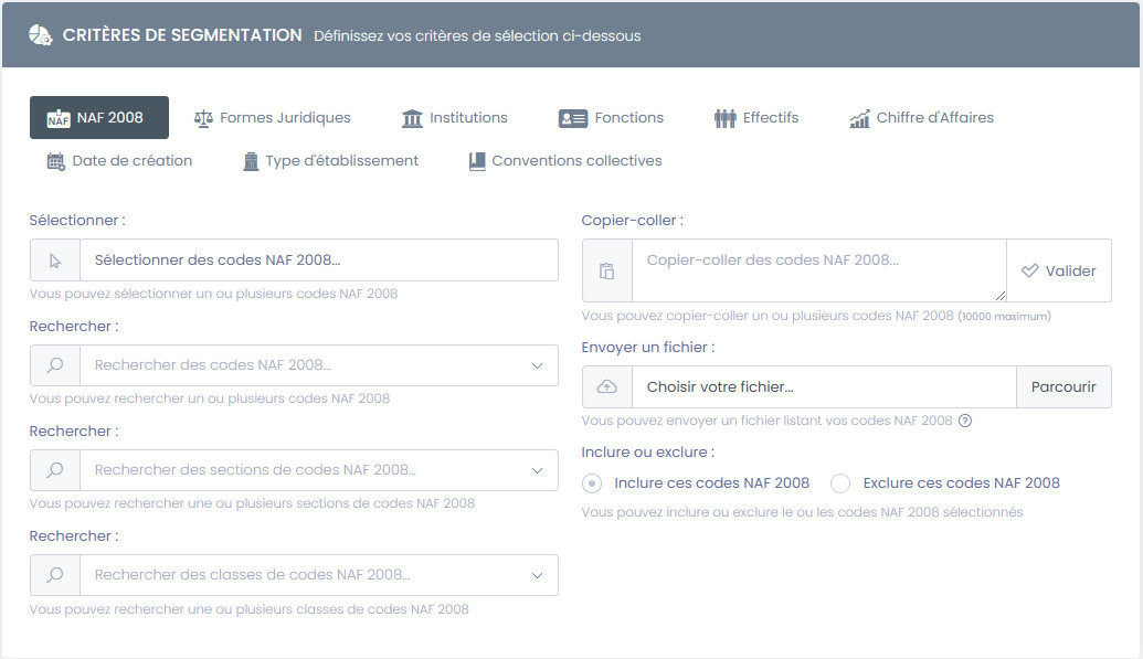 SIRET (B2B uniquement) : importer ou copier/coller une liste de SIRET à inclure ou exclure du ciblage.