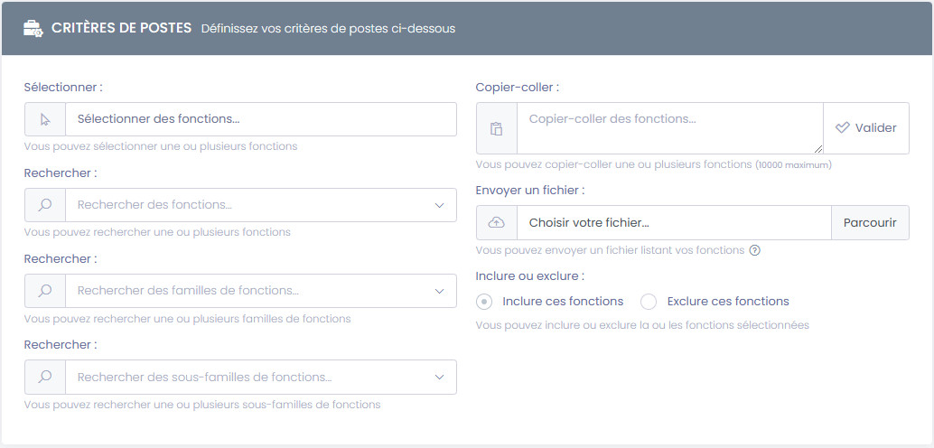 Cette catégorie permet de cibler les contacts Décideurs avec les mêmes critères que les profils B2B Entreprises, auxquels s'ajoutent un ciblage sur le service et/ou la fonction exercée par le contact dans l'entreprise, via 3 niveaux de ciblage : familles de fonctions, sous-familles, et libellé exact du poste.