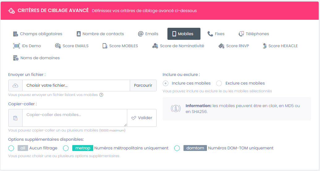 Mobiles : importer ou copier/coller une liste de N° Mobiles à inclure ou exclure du ciblage.