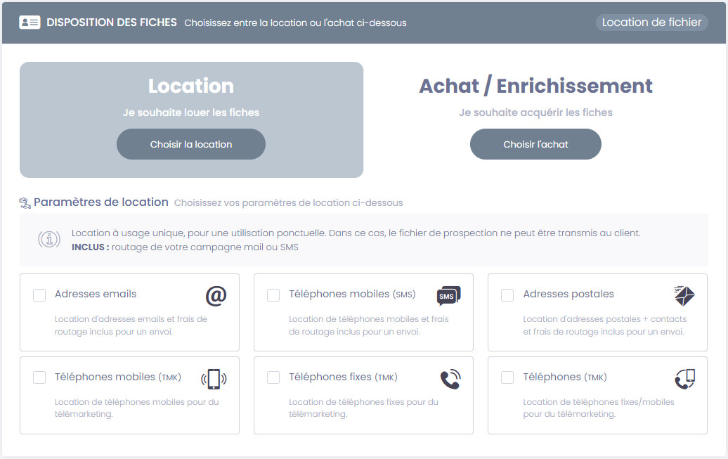 L'utilisateur peut choisir entre l'option "location" ou "Achat / Enrichissement" pour démarrer sa sélection, afin de déterminer l'usage qu'il souhaite faire des données :