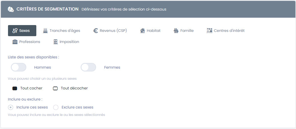 Cette catégorie permet de cibler les profils de particuliers avec de nombreux critères cumulables : critères socio-démographiques, famille, habitat, profession, centres d'intérêt...
