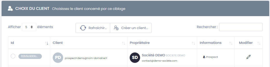Une fois le bouton "valider ce ciblage" activé, une nouvelle fenêtre est affichée, permettant d'effectuer différents actions.